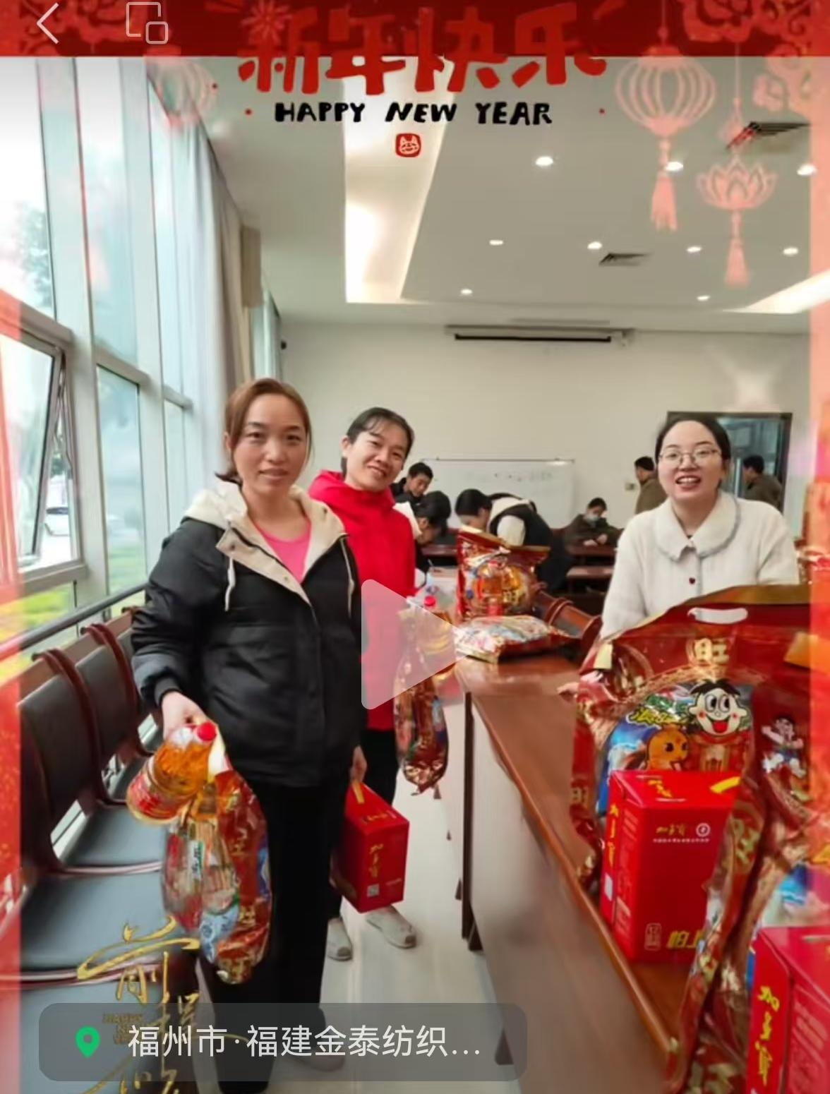 2025年1月23日,值此春節來臨之際,永泰縣金泰紡織有限公司爲全體員工送上了春節福利,讓每一位員工帶着滿滿的幸福感迎接新春的到來。一份份包裝精美的福利禮包,懷揣着溫暖送到每一位員工手中,爲每位員工的新年增添一份喜悅與祝福。當員工們接過沉甸甸的節禮時,臉上洋溢出幸福的笑容。